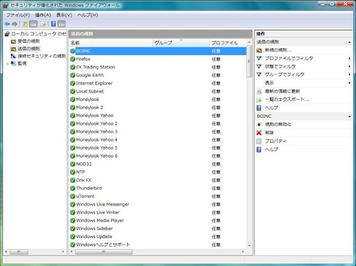 Vista には XP についてる受信側ファイアーウォールだけではなくて、送信側のファイアーウォールもあることに最近気がついた。なぜかコントロールパネルの Windows ファイアーウォールからは設定できなくて、管理ツールから